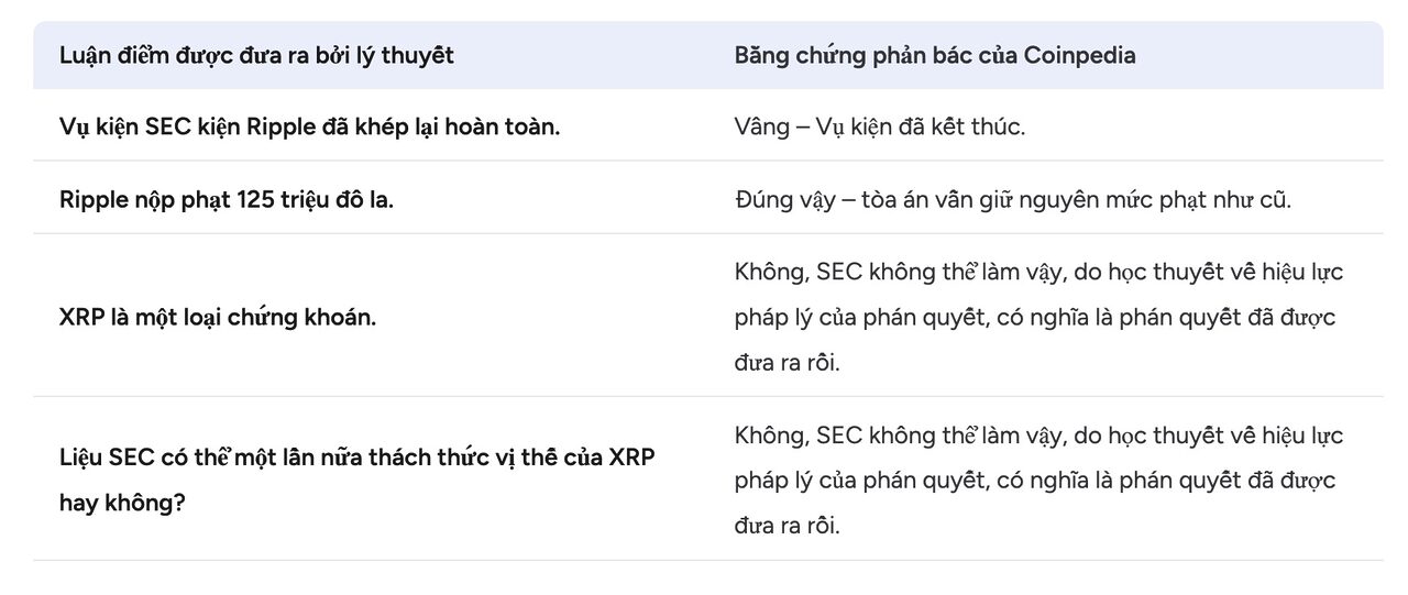 Chuyên gia pháp lý Bill Morgan giải thích rằng sự nhầm lẫn xung quanh vụ án xuất phát từ học thuyết về án lệ (res judicata), ngăn cản việc mở lại vụ án một khi phán quyết cuối cùng đã được đưa ra. Vì không có kháng cáo nào đang chờ xử lý, SEC không thể đưa ra cùng một cáo buộc chống lại Ripple một lần nữa.