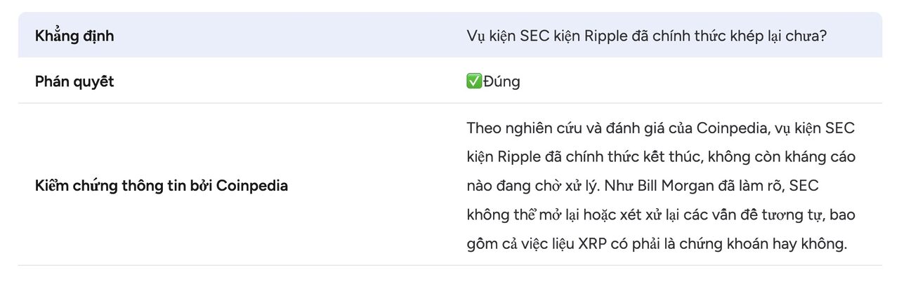Vụ kiện kéo dài giữa Ripple và SEC đã chính thức kết thúc về mặt pháp lý và thủ tục. Theo đánh giá của Coinpedia, kháng cáo đã chính thức chấm dứt vào ngày 7 tháng 8 năm 2025, khép lại vụ án.
