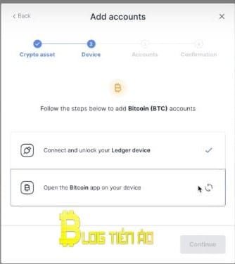 Bước 3: Chọn tài khoản được nhận trong danh sách bạn đẽ tạo trước đó. Legder live yêu cầu bạn mở Legder Nano X và chọn app Bitcoin.