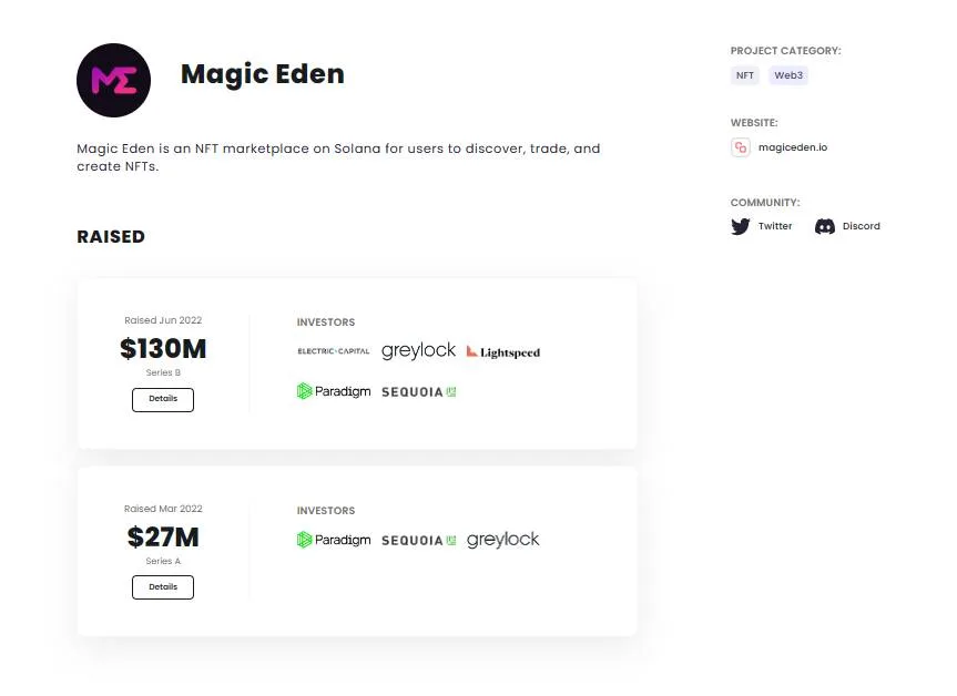 Vào tháng 07/2022, Magic Eden huy động thành công 130 triệu USD trong vòng Series B, nâng giá trị công ty lên 1,6 tỷ USD, với sự tham gia của Electric Capital, Greylock, Paradigm và Sequoia Capital, dù thị trường đang trong giai đoạn bearish.