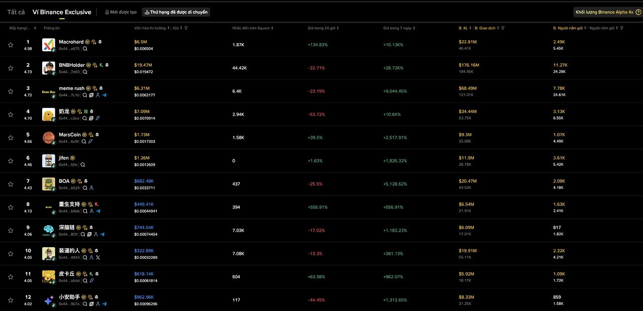 Ngoài các token hiệu suất cao có thể được xem xét niêm yết lên Binance Alpha trong tương lai thì đối với tất cả các token được ra mắt thông qua Meme Rush – Binance Wallet Exclusive, khối lượng giao dịch được tạo trên Binance Wallet (keyless) trong quá trình mua token từ khi tạo cho đến 30 ngày sau khi được giới thiệu trên Binance Alpha sẽ được tính là khối lượng giao dịch gấp 4 lần cho điểm Binance Alpha, nếu token vượt qua đánh giá của Binance Alpha.