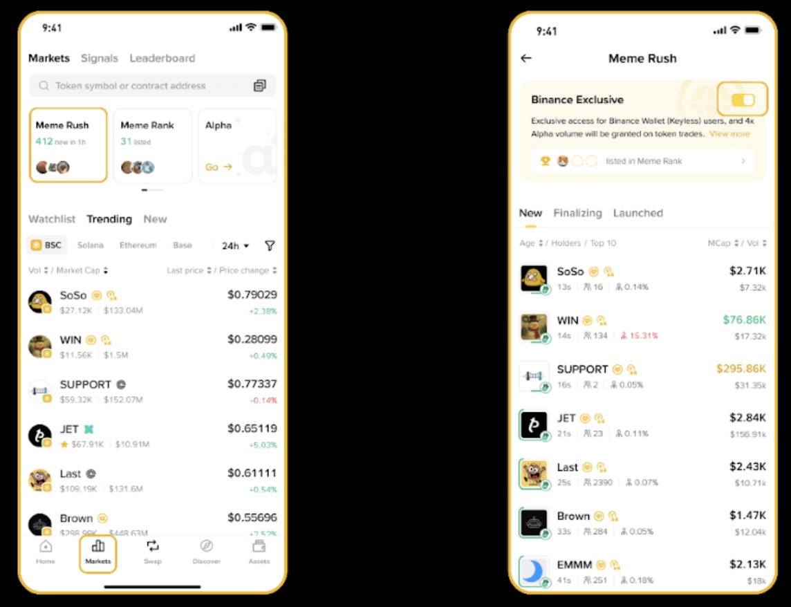 Binance Wallet giới thiệu Meme Rush – độc quyền của Binance Wallet, một tính năng được thiết kế riêng cho người dùng Binance Wallet (keyless) để khám phá và tham gia vào các dự án token meme mới.