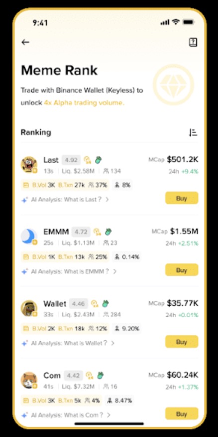 - Quyền truy cập độc quyền dành cho người dùng Binance Wallet (keyless): Người dùng đã được xác minh (KYC) có thể tham gia vào các đợt ra mắt token meme mới ở giai đoạn sớm nhất, tạo nên một môi trường công bằng, an toàn và minh bạch.