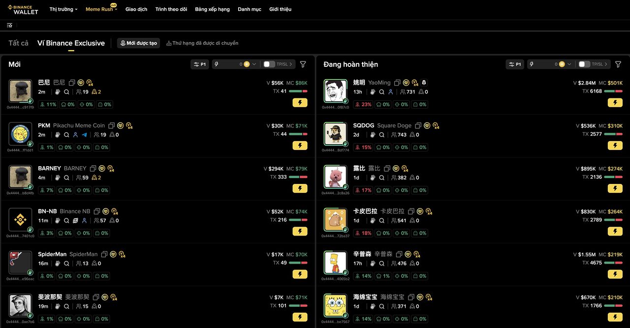 - Kiểm soát: Các token trên Meme Rush sẽ trải qua các giai đoạn, bao gồm “New Stage, Finalizing Stage và Migrated Stage”. Hiệu suất được thể hiện rõ ràng trên Bảng xếp hạng Meme, và các token có hiệu suất cao có khả năng được giao dịch trên Binance Alpha, tùy thuộc vào việc đáp ứng các yêu cầu về tính năng của Binance Alpha.