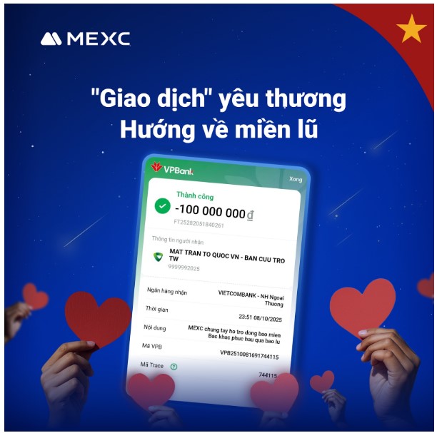 Với tinh thần trao đi để cùng phát triển, MEXC Việt Nam đã đóng góp 100 triệu đồng trực tiếp về tài khoản Ban cứu trợ TW – Mặt trận tổ quốc VN, nhằm hỗ trợ khẩn cấp, kịp thời cho các hộ gia đình chịu thiệt hại nặng nề trong đợt bão lũ vừa qua.