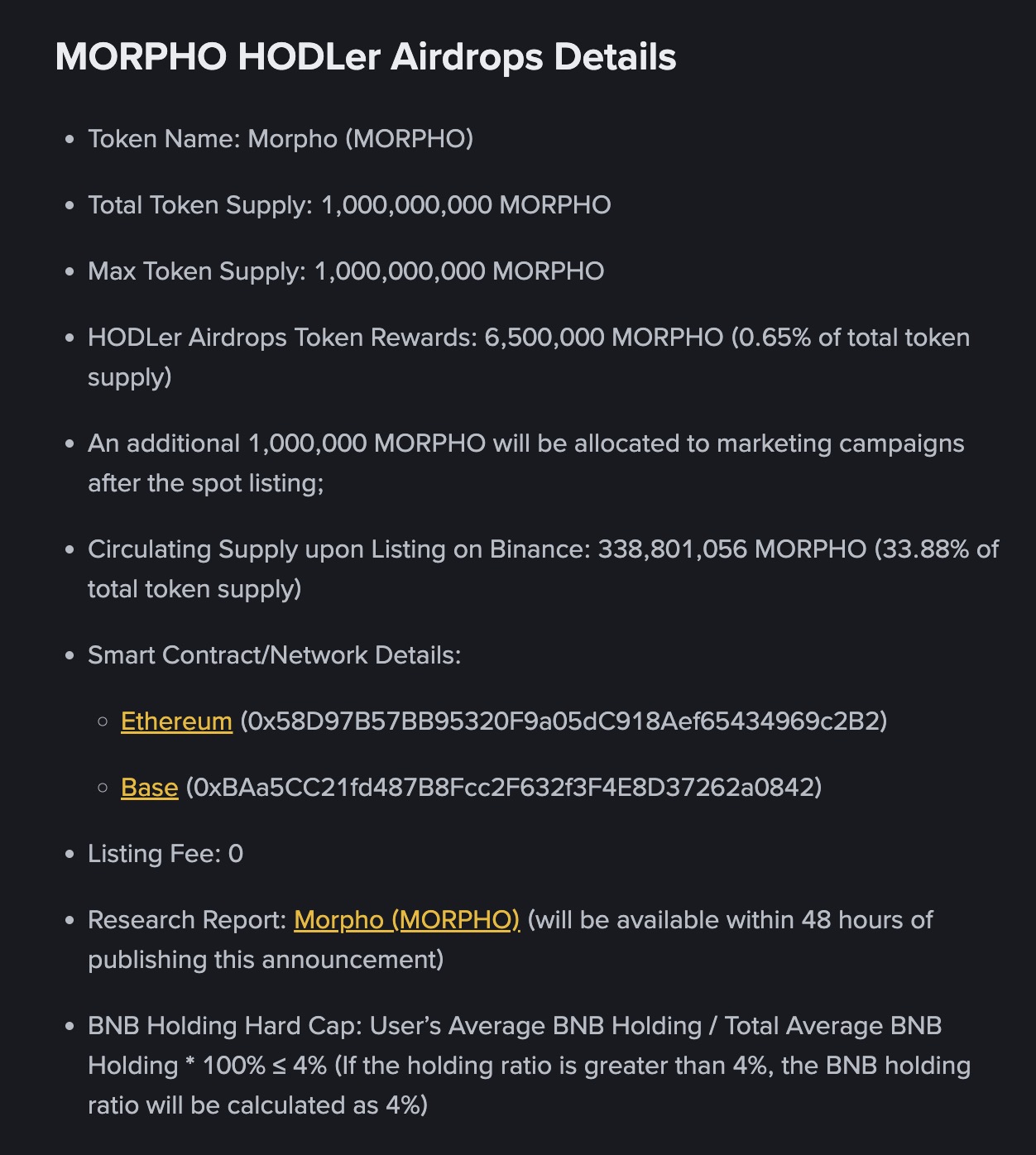 Người dùng đã stake BNB cho các sản phẩm Simple Earn và/hoặc On-Chain Yields từ 07:00 ngày 28/09 đến 06:59 ngày 30/09 sẽ nhận được airdrop MORPHO.