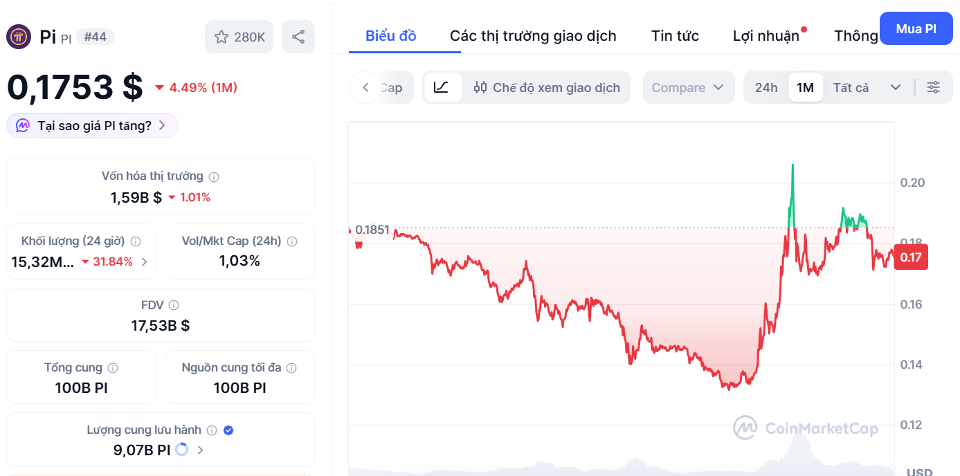 Từ mức đỉnh khoảng 3 USD sau khi mở mạng, giá Pi đầu tháng 2 chỉ còn 0,13 USD, tức giảm hơn 95%, hiện dao động quanh 0,19 USD. Nguyên nhân chính được cho là dự án liên tục mở khóa token, khiến nguồn cung lưu hành tăng lên 8,82 tỷ token.