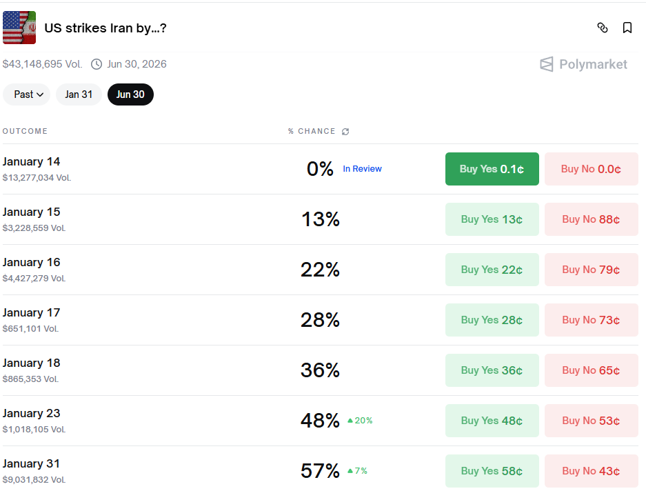 Cụ thể, đến tối 14/1 theo giờ Mỹ, thị trường định giá 65% khả năng xảy ra tấn công trước cuối tháng, và 74% nếu tính đến ngày 30/6.