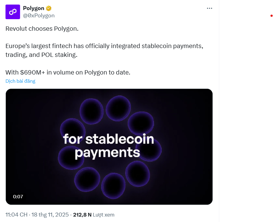 Revolut bắt đầu kết nối với Polygon từ tháng 12/2024 và đã xử lý hơn 690 triệu USD khối lượng giao dịch trên mạng này. Nhờ cấu trúc phí rẻ của Polygon, mọi giao dịch đều gần như tức thì, phù hợp với nhu cầu sử dụng tiền số ngày càng tăng trong đời sống.