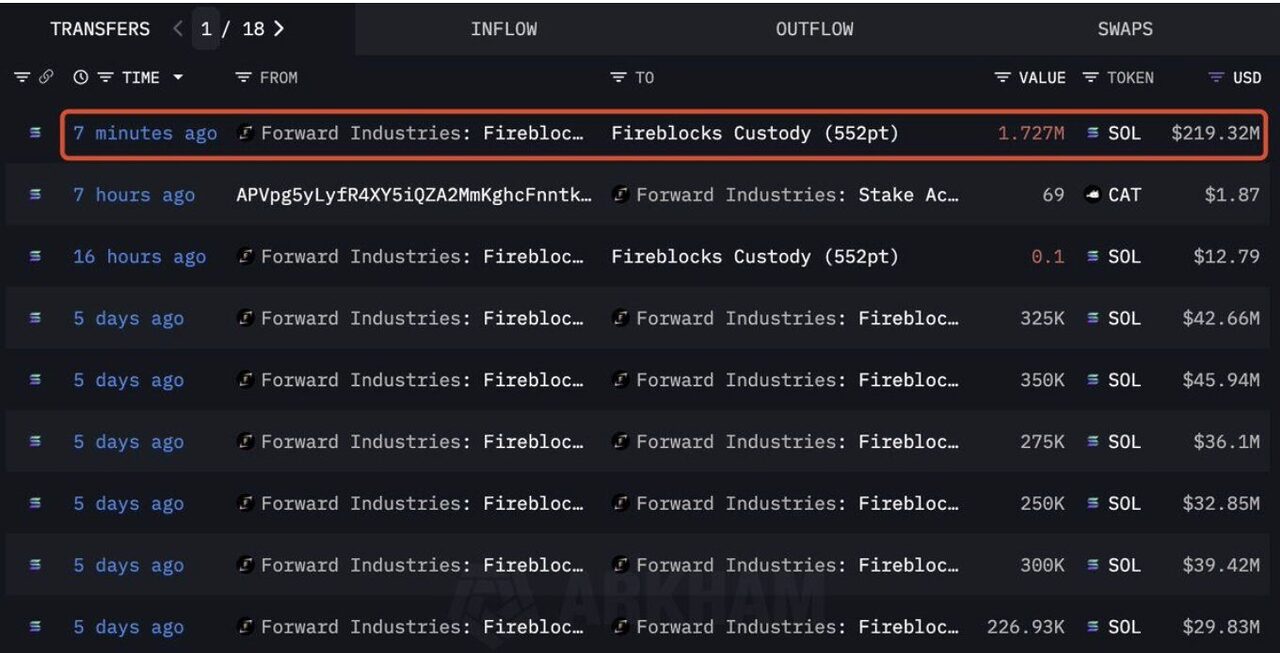 Dù vậy, giá đã giảm hơn 50%, khiến tâm lý thị trường đảo chiều hoàn toàn. Một giao dịch lớn gần đây – FWDI chuyển 1,727 triệu SOL trị giá 219 triệu USD – từng gây hoang mang, nhưng sau đó được xác nhận chỉ là tái cấu trúc nội bộ, không bán tháo.