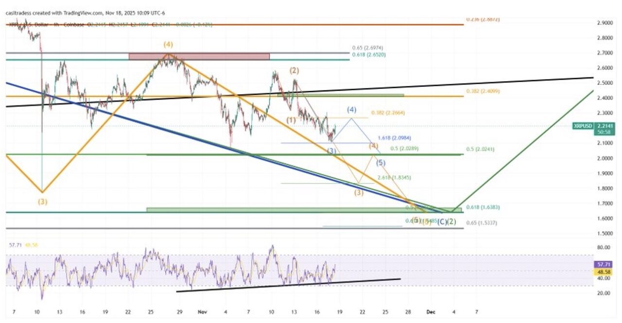 XRP is still likely making its way down toward the macro .5 fib support at $2.03, and the way price is moving fits that expectation. This move was never going to be a straight drop. Wave 2's are corrective! The… pic.twitter.com/EnKgZg4JfU