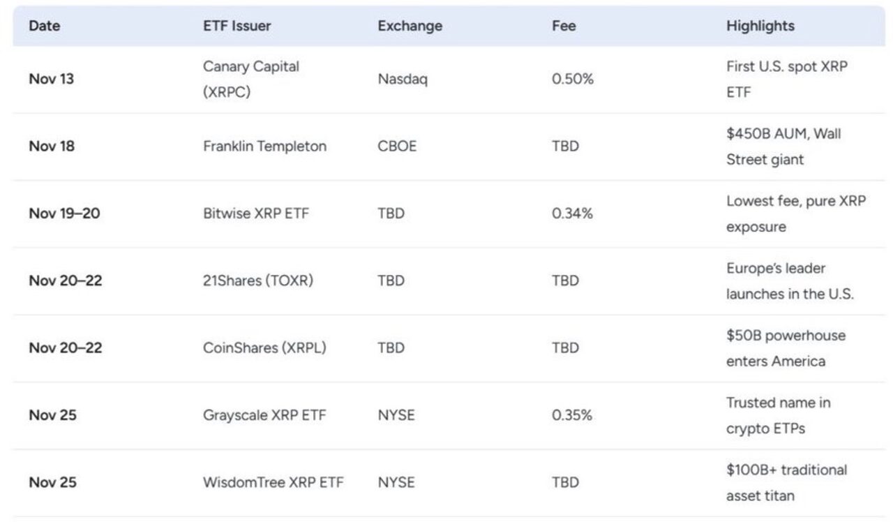 Sau khi Canary Capital và Franklin Templeton ra mắt các ETF XRP, năm ETF khác hiện đang chờ phê duyệt vào tháng 11. Nhiều nhà quan sát thị trường tin rằng những quỹ mới này sẽ thu hút thêm người mua, tăng nhu cầu và giúp đẩy giá XRP lên cao.