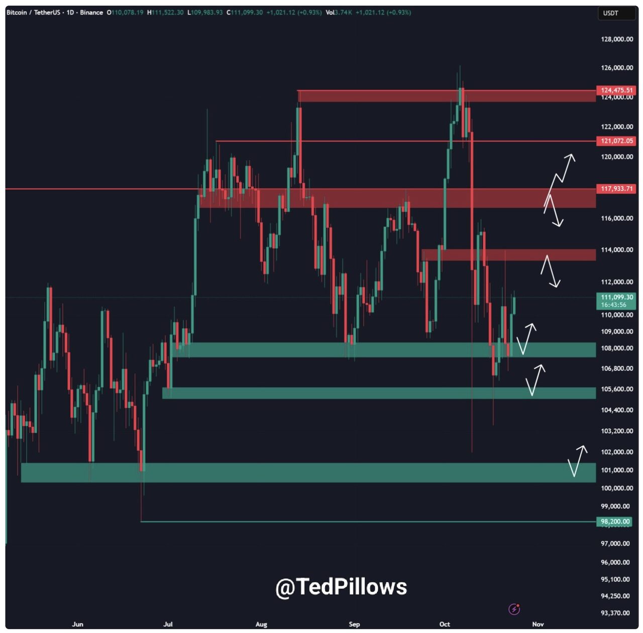 Giá hiện đang tiến về vùng kháng cự màu đỏ được đánh dấu giữa 111.000 đô la và 113.000 đô la, nơi người bán đã từng bước vào. Vùng này đã trở thành khu vực quyết định thành bại đối với các nhà giao dịch ngắn hạn.