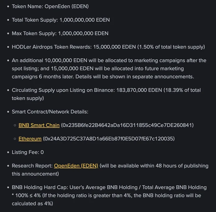 EDEN sẽ được Binance niêm yết dưới dạng “seed tag”. Dạng này để phân loại các dự án tiền điện tử thường đang trong giai đoạn phát triển ban đầu và có thể chưa có sản phẩm hoạt động, ngoài ra tiền điện tử niêm yết dạng này cũng có rủi ro cao.