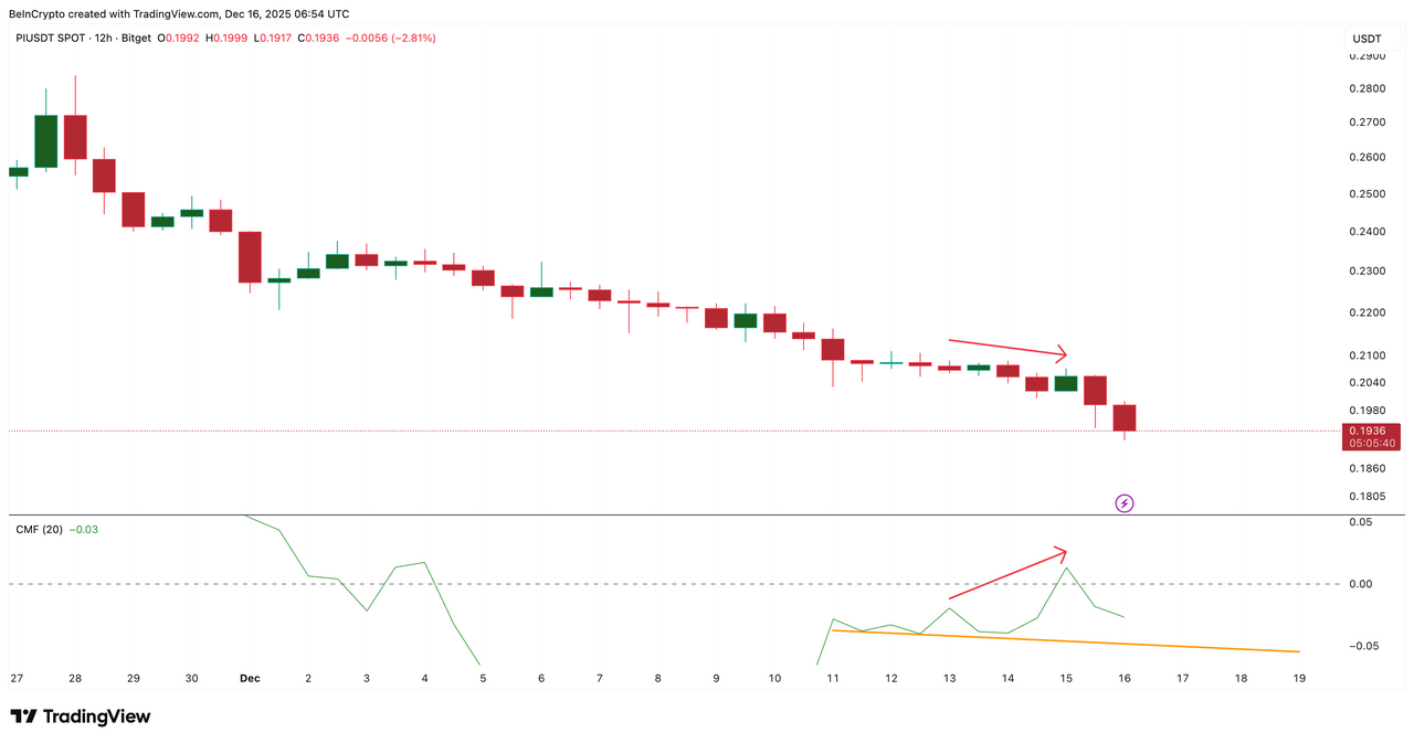 Tuy nhiên, Chaikin Money Flow (CMF) – đại diện cho dòng tiền lớn – vẫn nằm dưới mốc 0, nghĩa là vốn lớn tiếp tục rút khỏi Pi Coin.