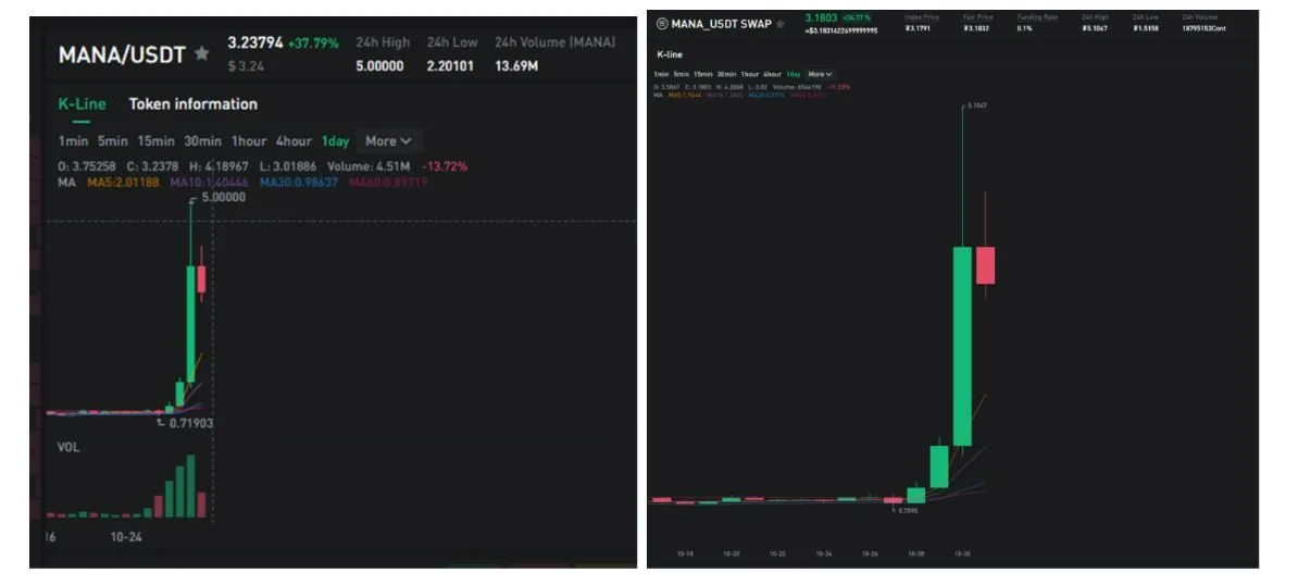 Ví dụ, MANA / USDT từ mức giá thấp nhất là 0,71903 USDT tăng lên mức giá cao nhất là 5 USDT. Với tổng tỷ suất lợi nhuận tăng 595,38% ở giao dịch giao ngay.