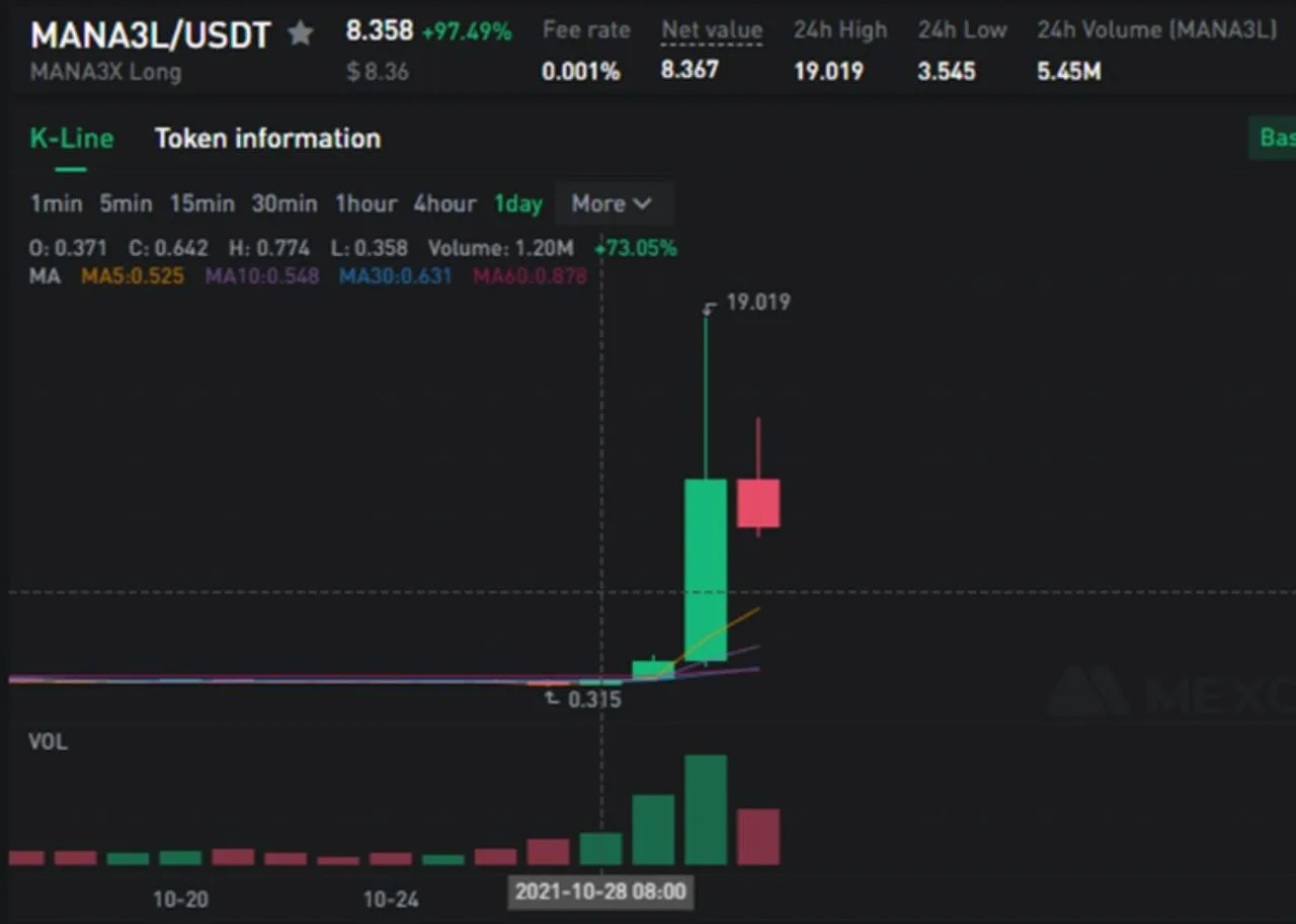 Còn MANA3L từ mức giá thấp nhất là 0,315 USDT đã tăng lên mức giá cao nhất là 19,019 USDT. Với tổng lợi suất tăng khoảng 5.937,78% trong các quỹ ETF có đòn bẩy
