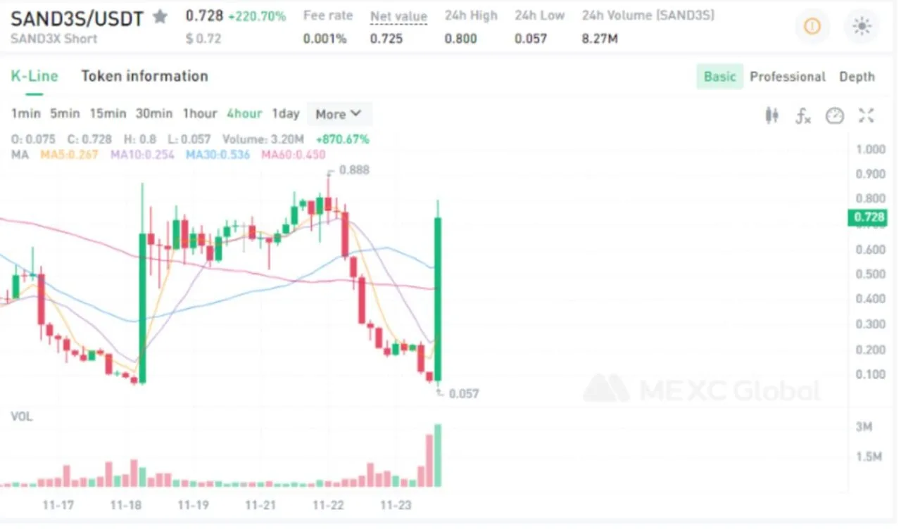Từ hình trên chúng ta có thể thấy, giá SAND3S đã xuống mức thấp nhất là 0,057 USDT, thấp hơn 0,1 USDT. Do đó, nó sẽ kích hoạt Cơ chế hợp nhất.