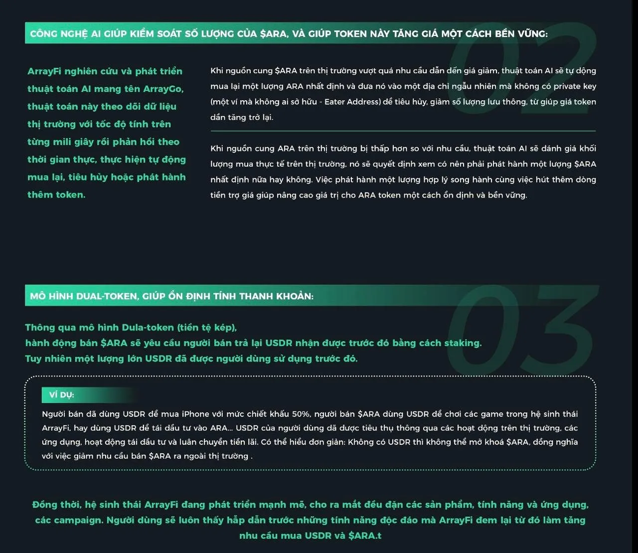 Thuật toán AI sẽ duy trì sự cân bằng giữa cung và cầu của ARA và USDR. Khi mọi người bán ARA, AI sẽ mua lại một số ARA và tiêu hủy chúng vào một địa chỉ cụ thể. Khi cung cấp ARA giảm, giá ARA sẽ tăng dần. Khi giá ARA quá cao, AI sẽ phát hành thêm ARA để cân bằng giá.