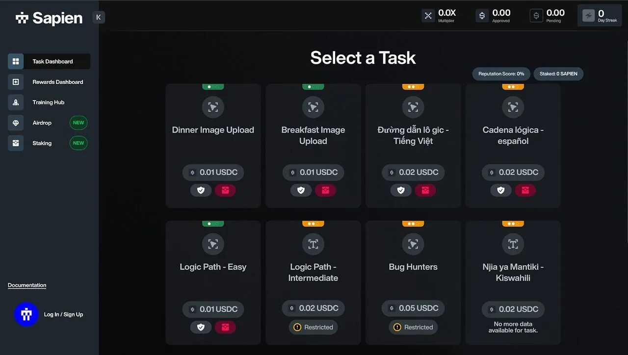 Staking: Người đóng góp khóa token $SAPIEN làm tài sản thế chấp trước khi thực hiện nhiệm vụ, đảm bảo trách nhiệm và mở quyền truy cập vào các nhiệm vụ giá trị cao hơn.