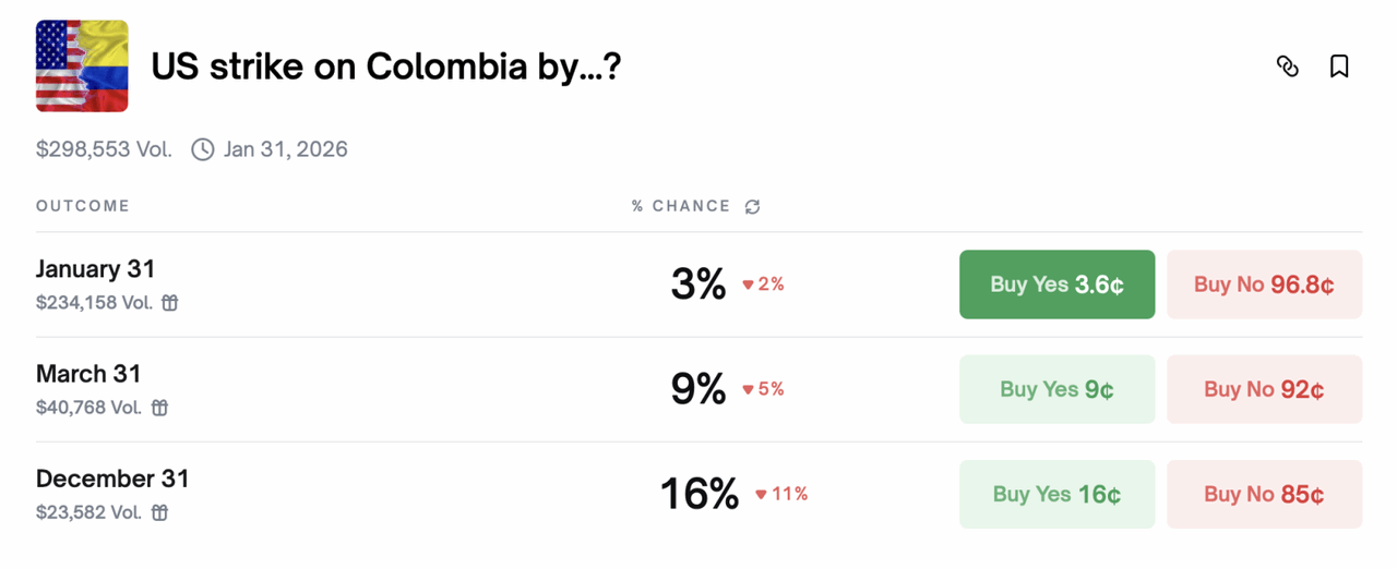 Polymarket hiện định giá 16% khả năng Mỹ tấn công Colombia trước cuối năm 2026, trong đó 3% có thể xảy ra ngay trong tháng này.