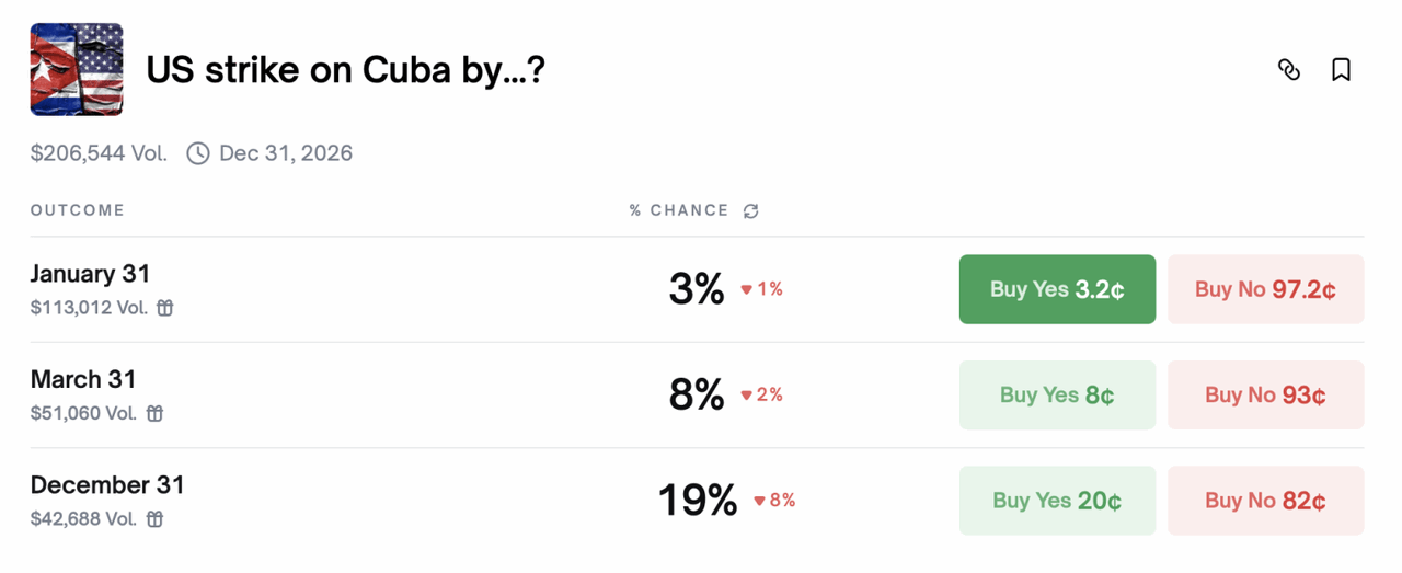Cuba – đồng minh lâu năm của Venezuela – thậm chí có xác suất bị tấn công lên tới 19%. Ngoại trưởng Marco Rubio cảnh báo Havana đang “gặp rắc rối lớn” vì ủng hộ Maduro.
