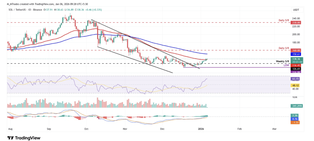 Bước sang năm mới, Solana (SOL) đang cho thấy sức mạnh đáng chú ý. Tại thời điểm ghi nhận, SOL giao dịch trên mốc 137 USD, duy trì đà tăng sau khi tăng hơn 7% trong một tuần.