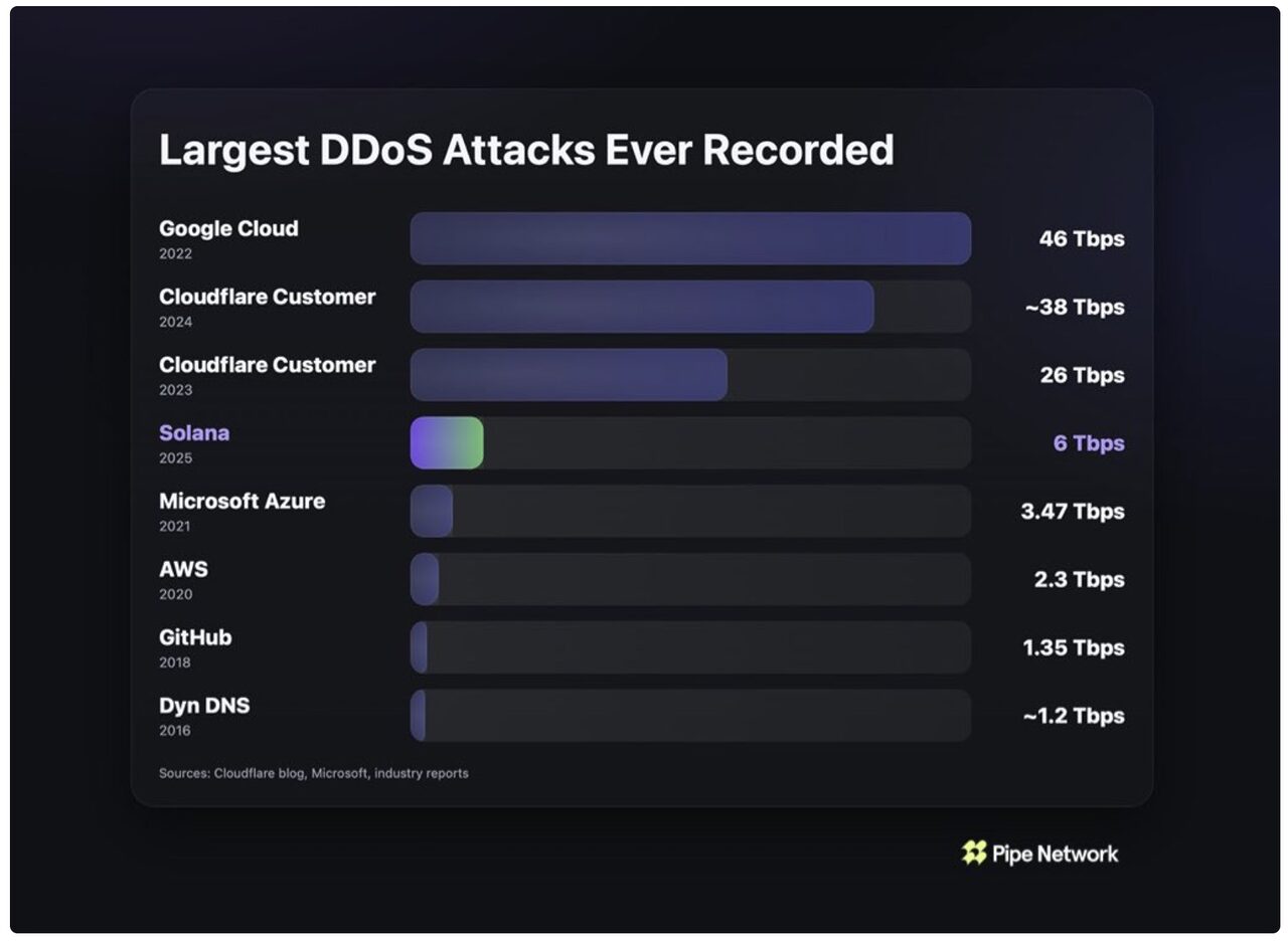 🚨BREAKING: @Solana has been under a sustained DDoS attack for the past week, peaking near 6 Tbps, the 4th largest attack ever recorded for any distributed system. Network data shows no impact, with sub second confirmations and stable slot latency.