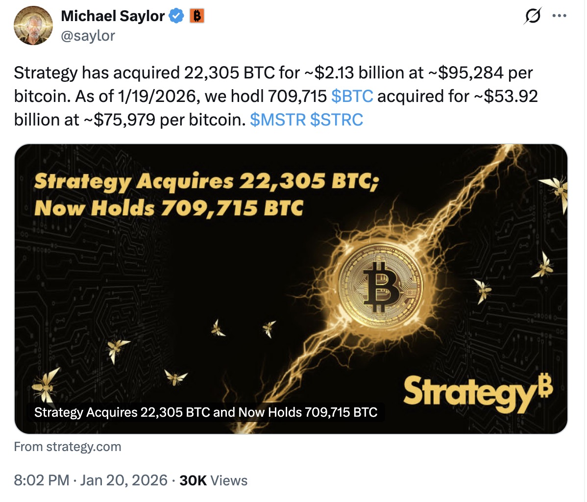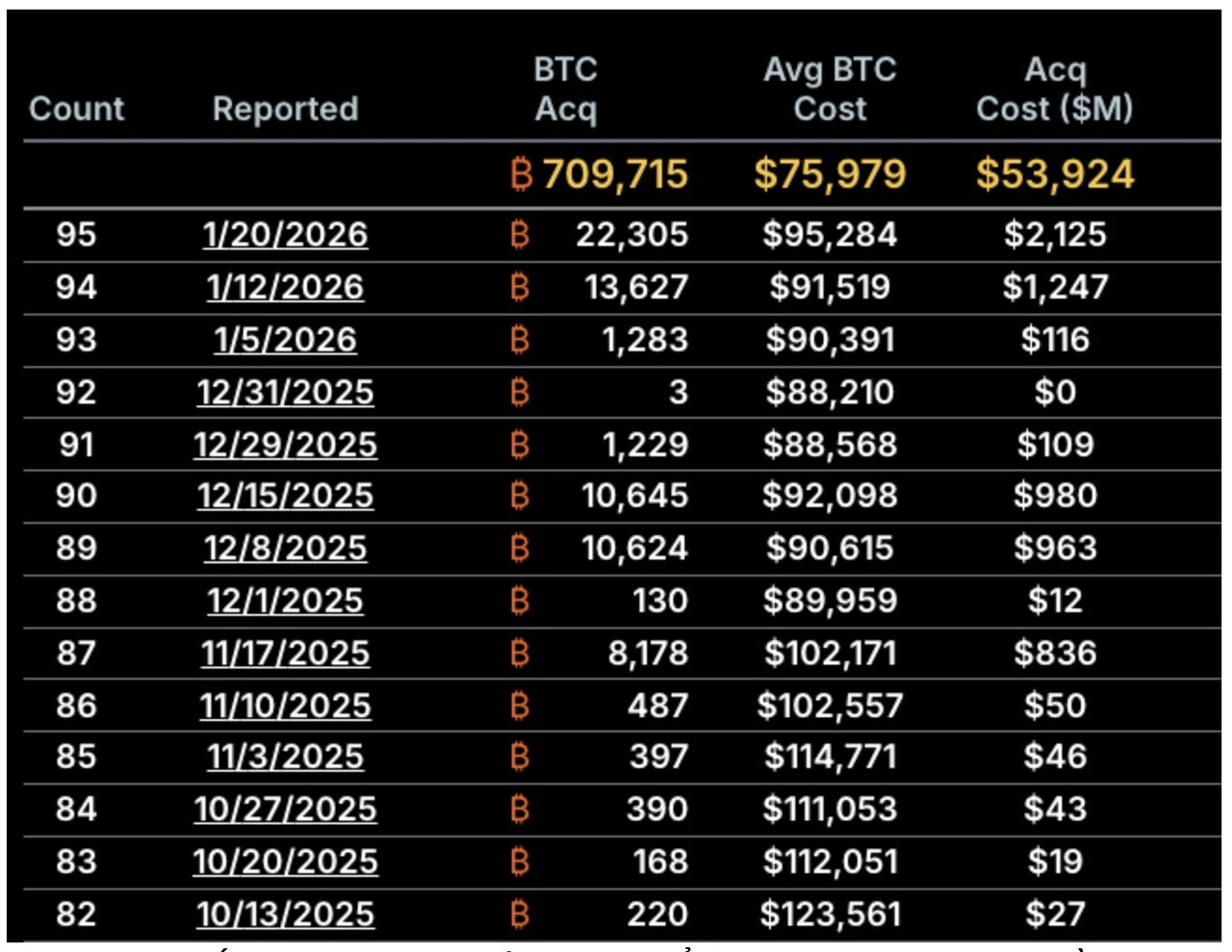 Strategy đã mua thêm 22.305 BTC với giá khoảng 95.284 USD mỗi đồng, nâng tổng số BTC nắm giữ lên tới 709.715 BTC.