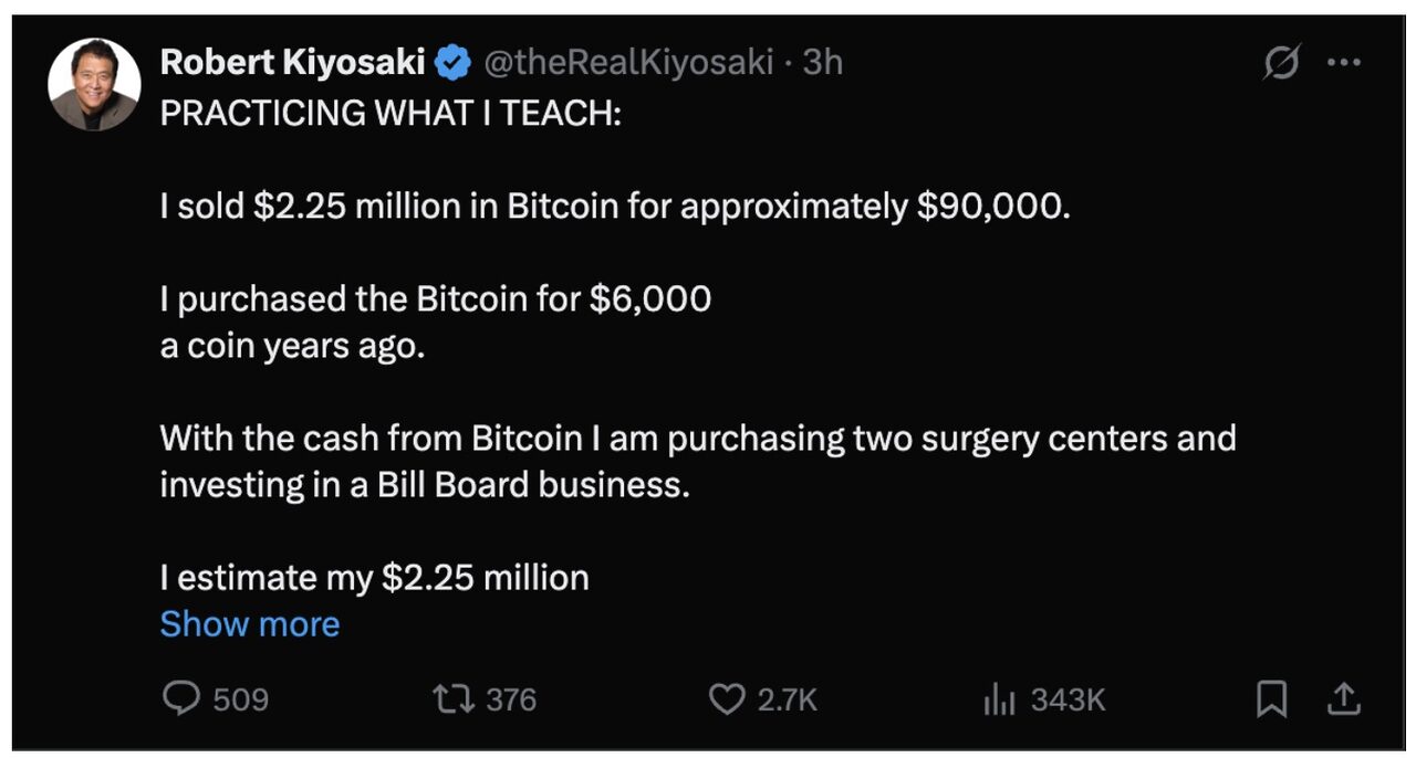 Trong khi toàn thị trường đang có sự điều chỉnh lớn, Kiyosaki nói rằng ông đã bán BTC của mình ở mức giá 90.000 USD.