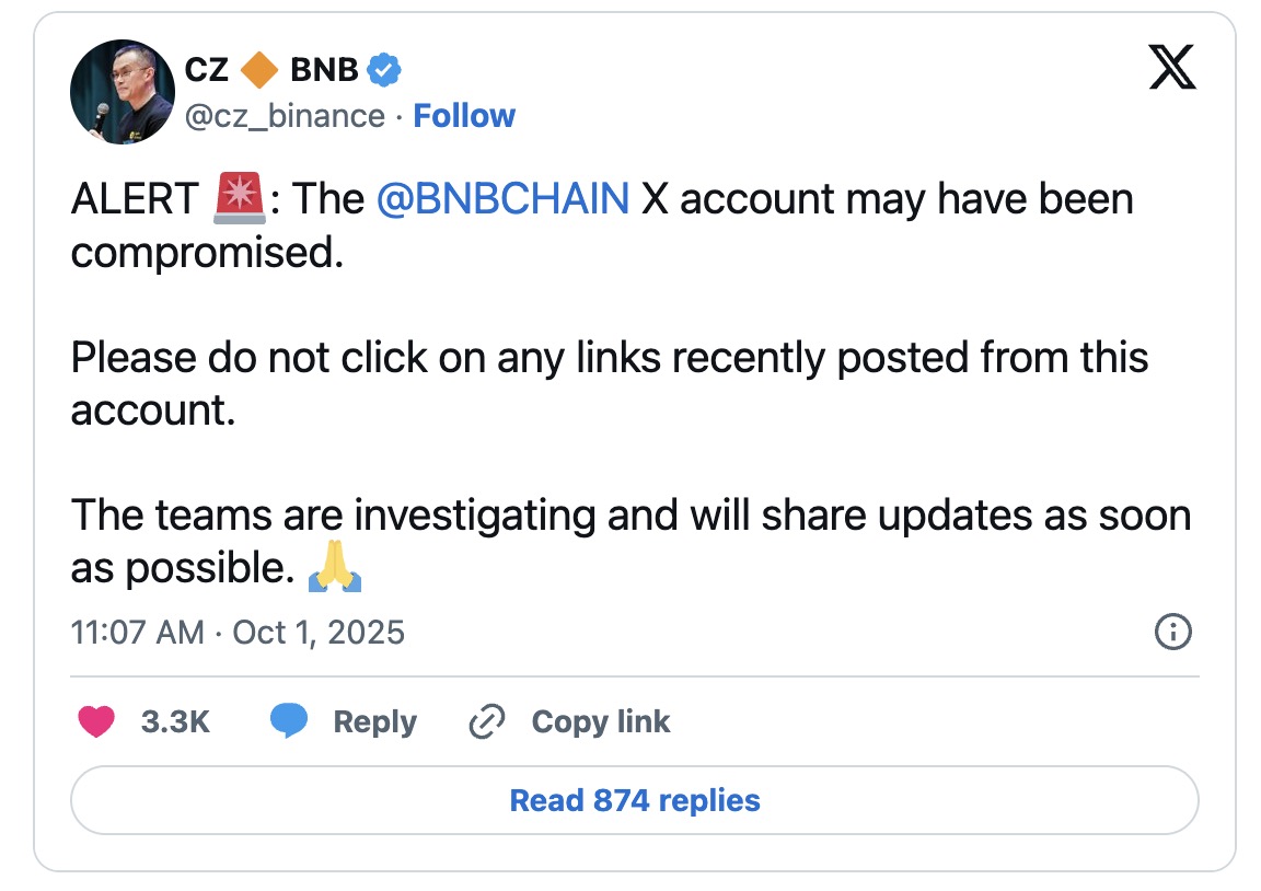 Cựu CEO Binance, Changpeng Zhao đã lên tiếng cảnh báo cộng đồng của mình rằng tài khoản X chính thức của BNB Chain đã bị hacker tấn công.