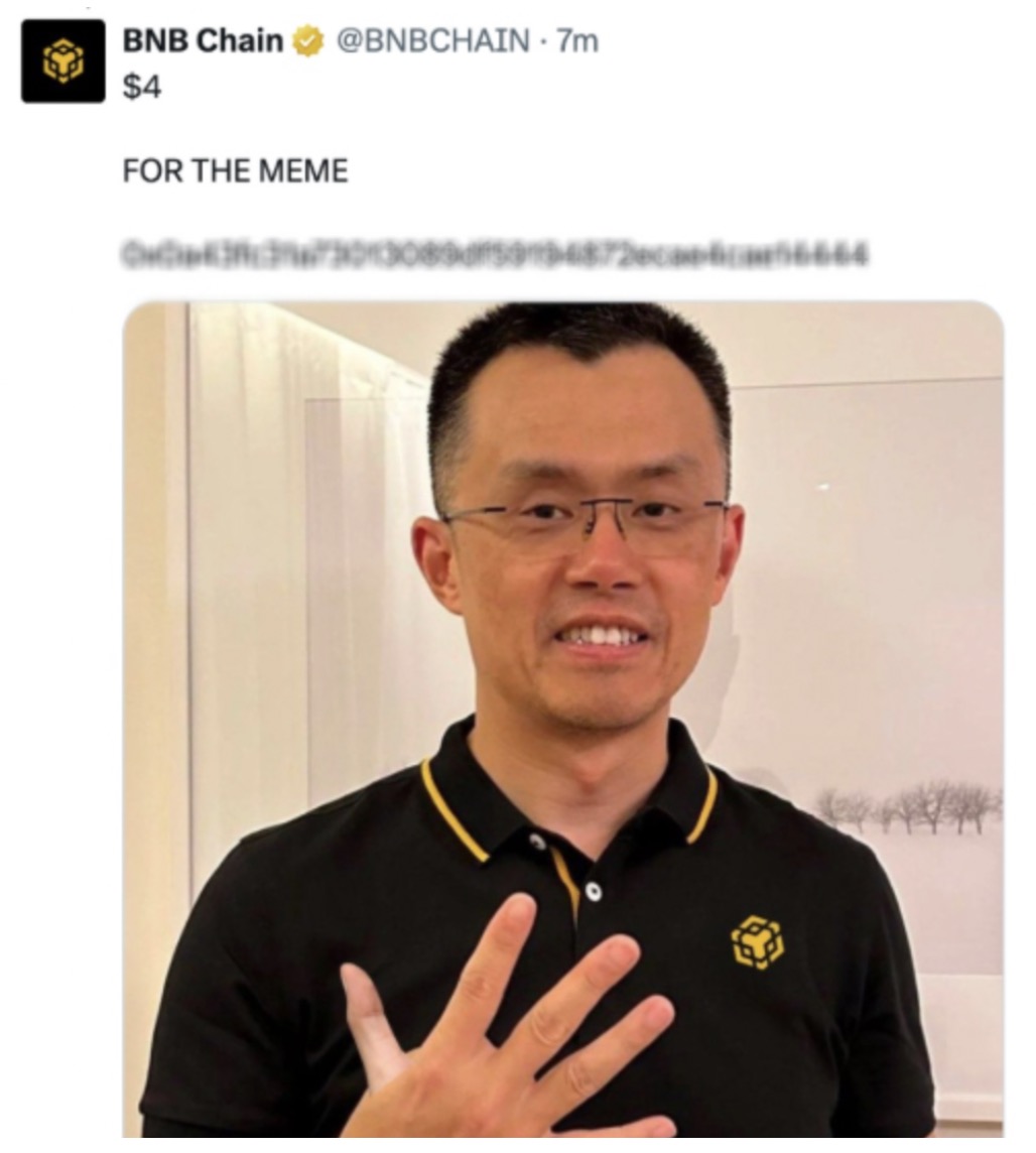 Điều này được phát hiện là do vài giờ trước, tài khoản này đã đăng “$4” cùng với cụm từ “FOR THE MEME”, kèm theo đó là địa chỉ ví và hình ảnh của CZ.