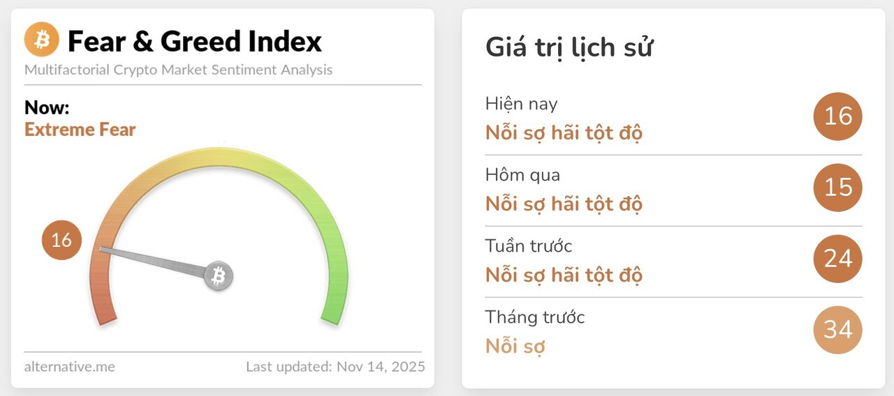 Tâm lý thị trường trở nên tiêu cực, với Chỉ số Sợ hãi & Tham lam Tiền điện tử giảm xuống còn 16, phản ánh sự lo lắng ngày càng tăng của các nhà giao dịch.