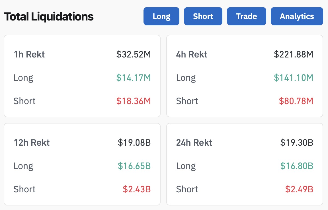 Đợt giảm này đã gây ra tình trạng thanh lý hàng loạt trên khắp các sàn giao dịch tiền điện tử. Trong 24 giờ qua, hơn 1.6 triệu nhà giao dịch đã bị thanh lý, với tổng giá trị thanh lý lên tới 19.31 tỷ USD, bao gồm 16.82 tỷ USD từ các vị thế long.
