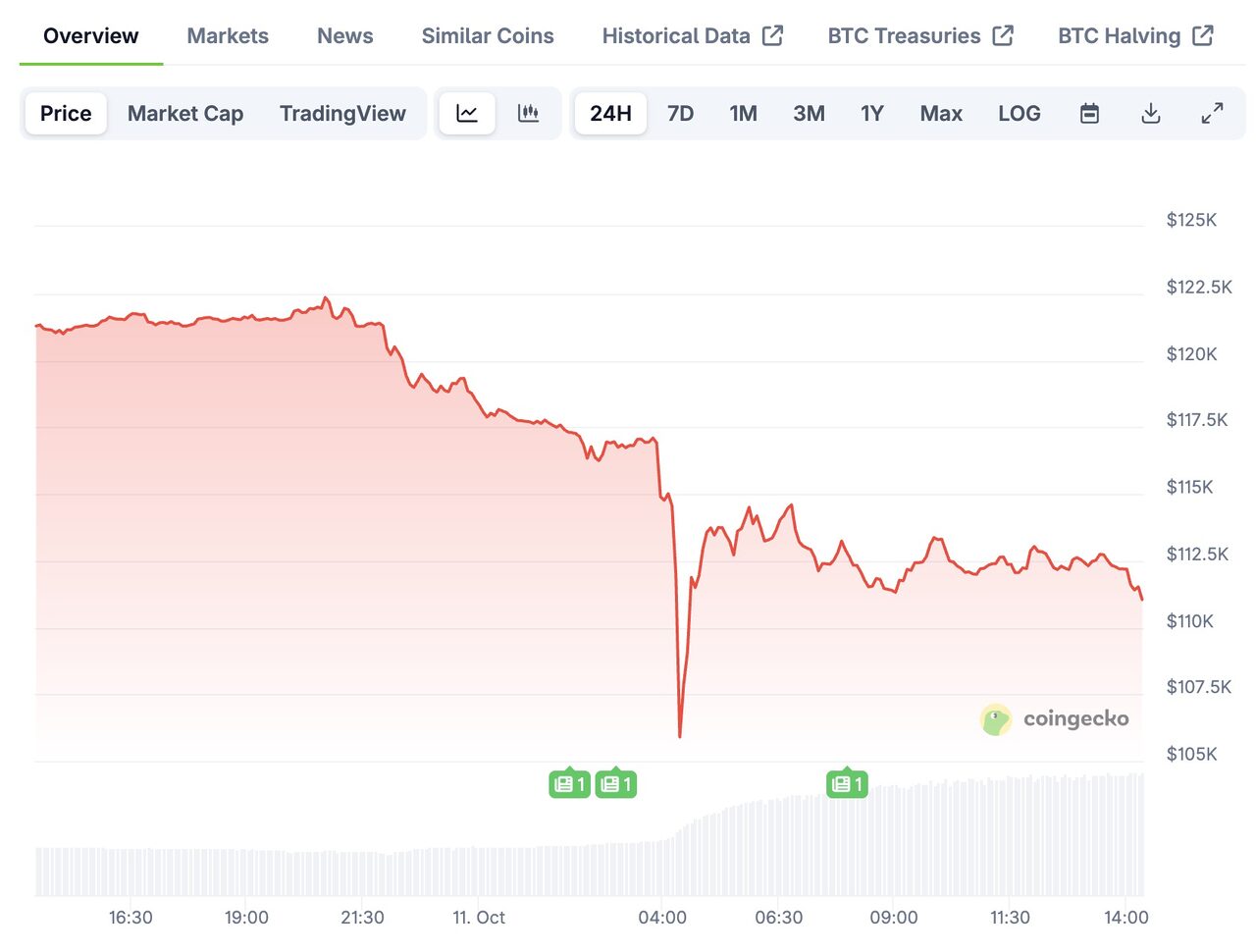 Thị trường tiền điện tử đang lao dốc mạnh mẽ hôm nay, xóa sổ hơn 400 tỷ USD giá trị khi tổng vốn hóa thị trường giảm xuống còn 3.74 nghìn tỷ USD. Bitcoin đã giảm xuống mức thấp nhất là 105.262 USD trước khi phục hồi nhẹ lên 111.000 USD, trong khi Ethereum giảm hơn 16%, và nhiều altcoin đã chứng kiến mức lỗ lên tới 80–90% ở mức tồi tệ nhất.