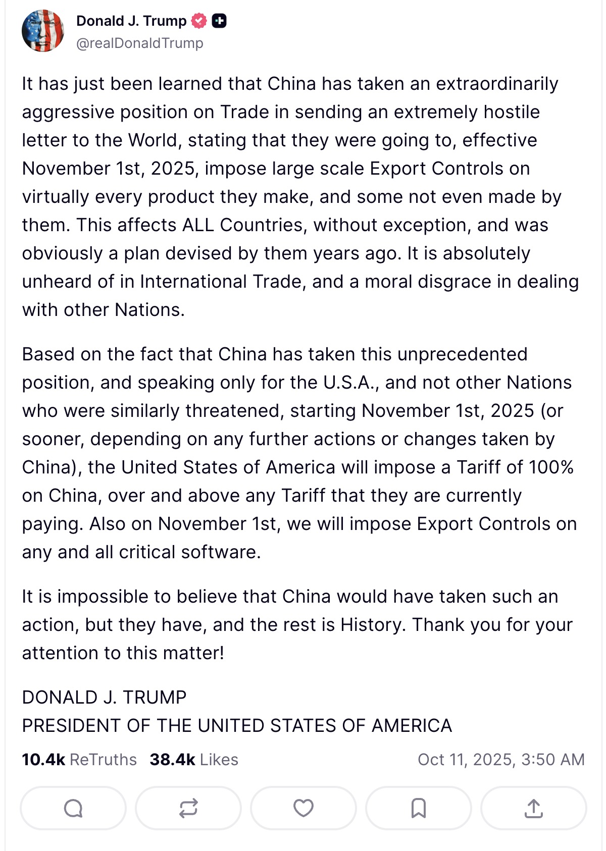 Nguyên nhân chính xuất hiện vào cuối ngày thứ sáu khi Tổng thống Hoa Kỳ Donald Trump tuyên bố trên Truth Social rằng Hoa Kỳ sẽ áp thuế 100% đối với hàng nhập khẩu từ Trung Quốc bắt đầu từ ngày 1 tháng 11.