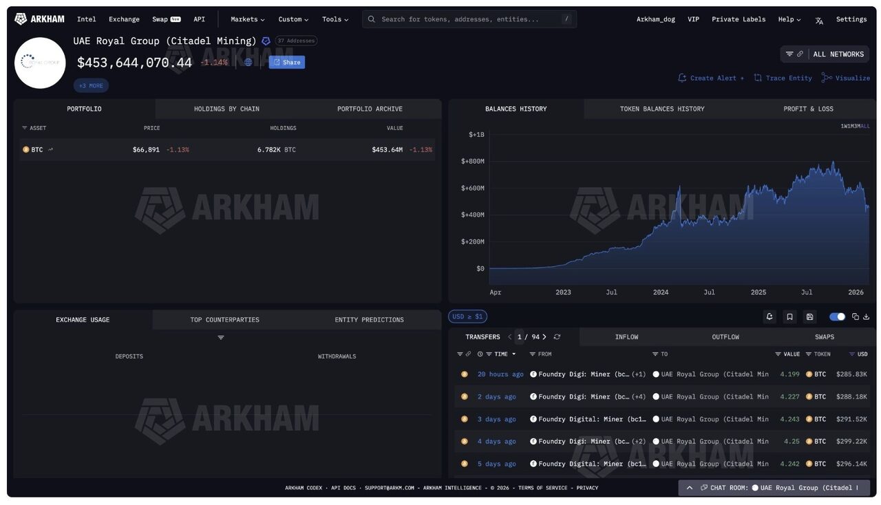 Công ty phân tích blockchain Arkham Intelligence đã theo dõi 37 ví tiền điện tử có liên kết với Citadel Mining, một hoạt động có liên hệ với Tập đoàn Hoàng gia Abu Dhabi thông qua nhánh đầu tư của họ.