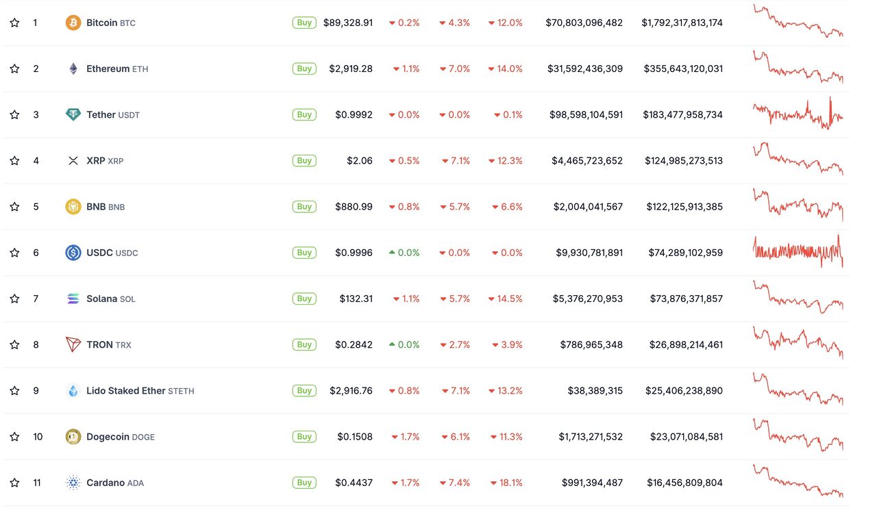 Trong 24 giờ qua hầu hết các altcoin đều đang giảm từ 5 đến 10%, bao gồm Ethereum, XRP, Solana, Cardano, Dogecoin và BNB.