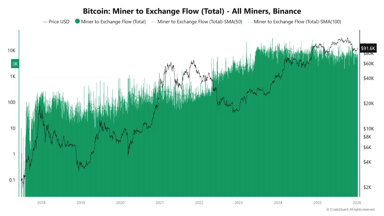 Dữ liệu on-chain ghi nhận lượng Bitcoin chuyển từ ví thợ đào lên sàn – đặc biệt là Binance – đang tăng, vốn thường là tín hiệu chuẩn bị bán ra.