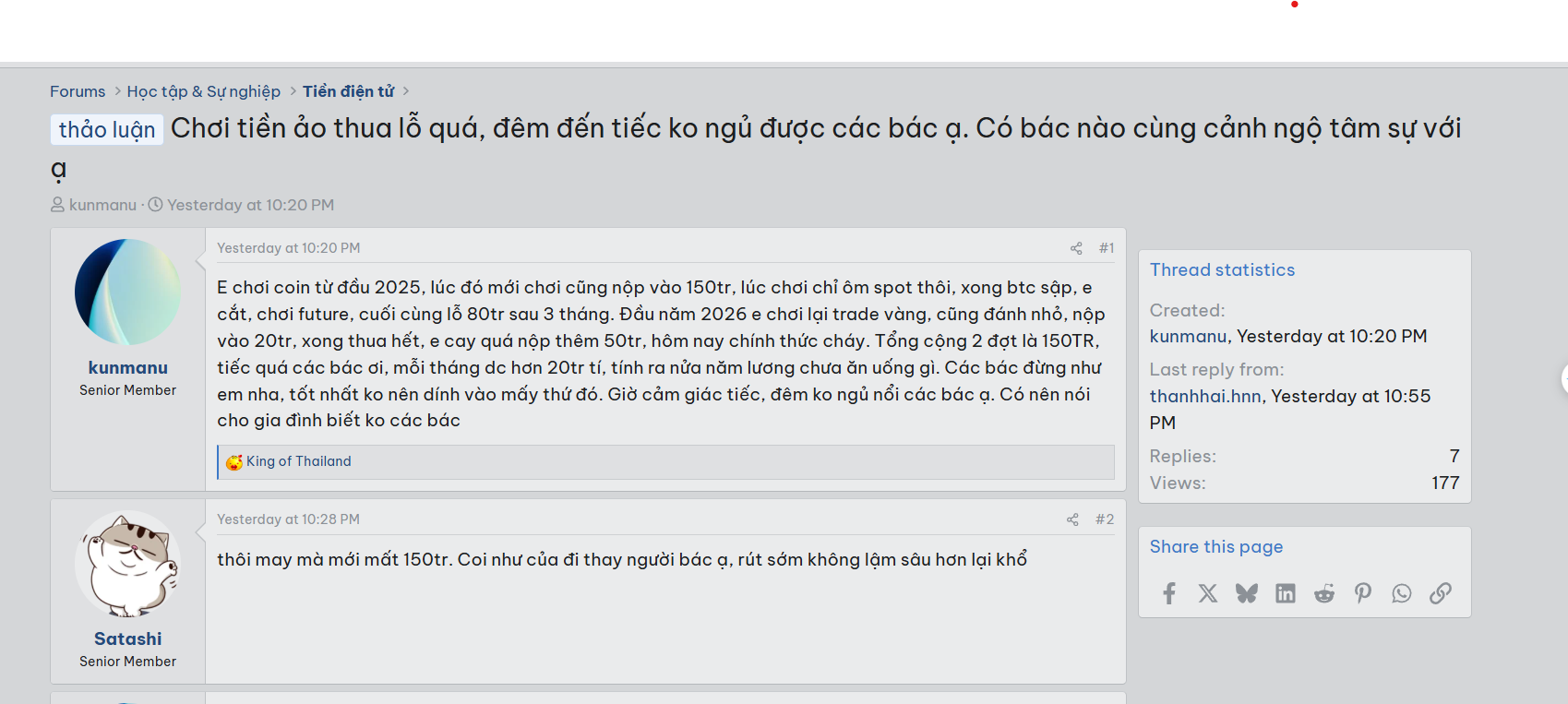 Một bài đăng trên diễn đàn mới đây thu hút sự chú ý khi một nhà đầu tư chia sẻ câu chuyện thua lỗ nặng nề khi tham gia thị trường crypto.