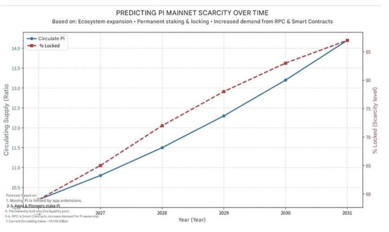 Theo các dự báo đang được lan truyền trong cộng đồng Pi, tỷ lệ token Pi bị khóa vĩnh viễn có thể tăng từ khoảng 60% hiện nay lên hơn 85% vào năm 2031, làm thắt chặt nguồn cung lưu thông ngay cả khi hoạt động tổng thể của hệ sinh thái tăng lên.