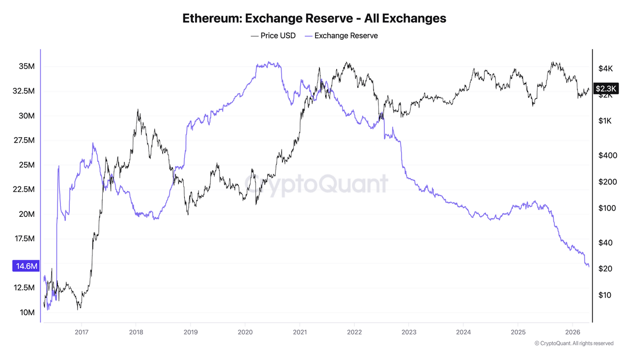 Các tín hiệu thị trường cũng đang ủng hộ kịch bản tích cực cho Ethereum. Theo CryptoQuant, lượng ETH trên các sàn đã giảm xuống còn khoảng 14,6 triệu ETH, mức thấp nhất kể từ năm 2016.
