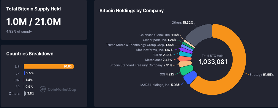 Song song, số lượng BTC do các doanh nghiệp niêm yết nắm giữ vượt qua con số 1 triệu BTC (~113 tỷ USD), chiếm gần 5% tổng nguồn cung. Strategy (trước đây là MicroStrategy) đang giữ 640.031 BTC (~77 tỷ USD), trong khi Tether tăng lượng nắm giữ lên 86.335 BTC như một phần chiến lược đa dạng hóa lợi nhuận. Dòng vốn tổ chức ngày càng lớn đang củng cố niềm tin về triển vọng dài hạn của thị trường.