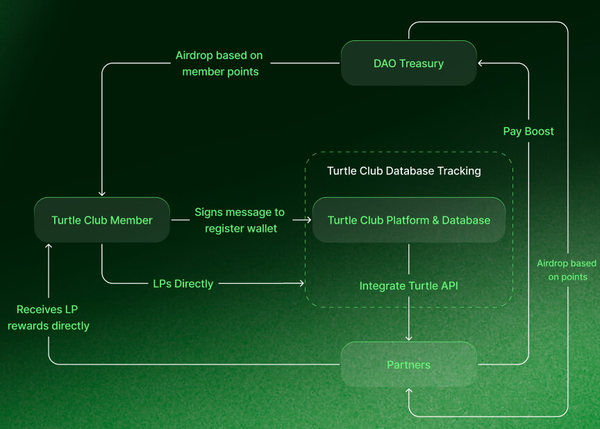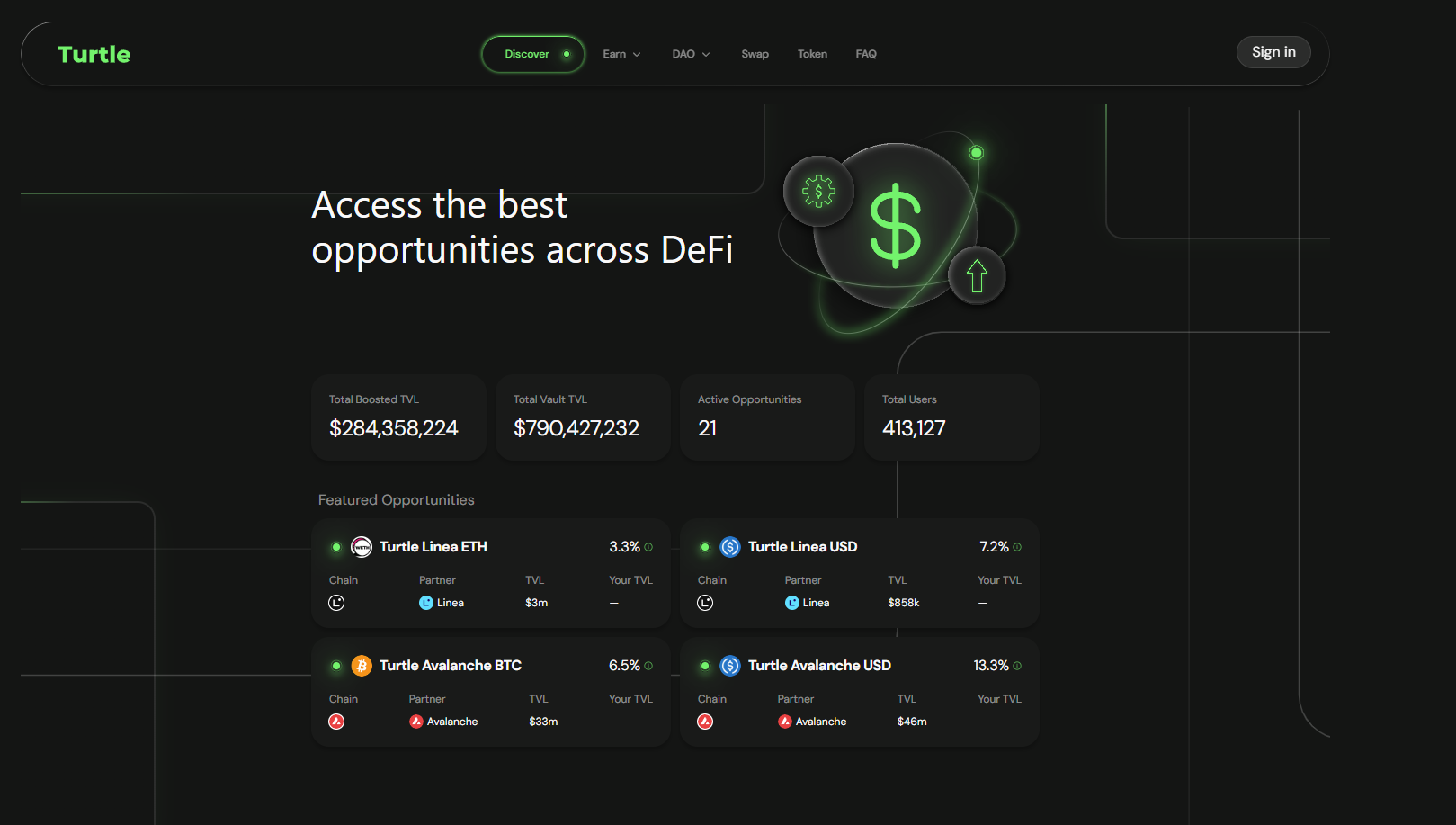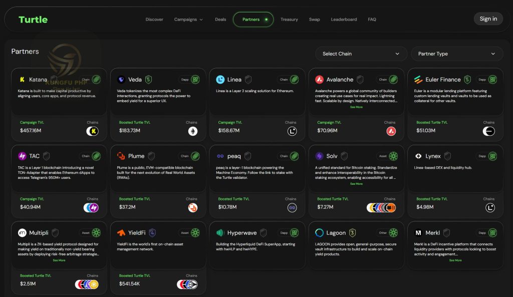 Nhà cung cấp thanh khoản (LPs): chỉ cần đăng ký ví, có thể tiếp tục hoạt động trên các giao thức đối tác và nhận thêm thưởng qua Boosted Deals hoặc gửi tài sản vào Turtle Vaults để nhận lợi nhuận độc quyền.