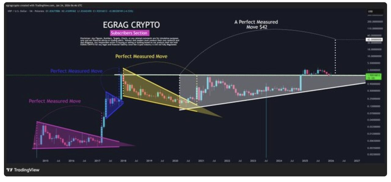 Bất chấp đợt điều chỉnh giảm gần đây, một số nhà phân tích XRP dài hạn cho rằng cấu trúc kỹ thuật tổng thể vẫn còn nguyên vẹn. Nhà phân tích thị trường tiền điện tử EGRAG cho biết mức giá 42 đô la thường được nhắc đến cho XRP dựa trên cấu trúc thị trường dài hạn chứ không phải sự hưng phấn đầu cơ.