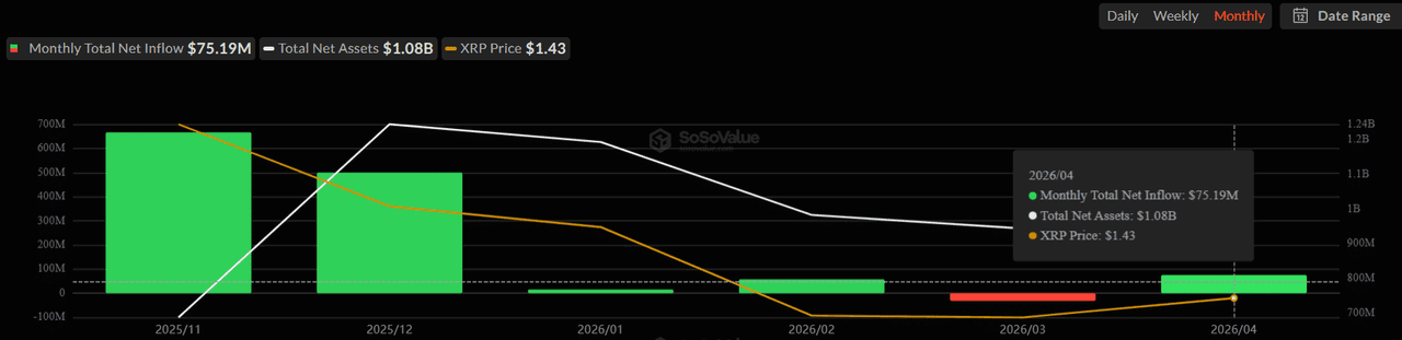 - Dòng vốn vào XRP ETF đạt hơn 75 triệu USD trong tháng 4, vượt cả quý trước